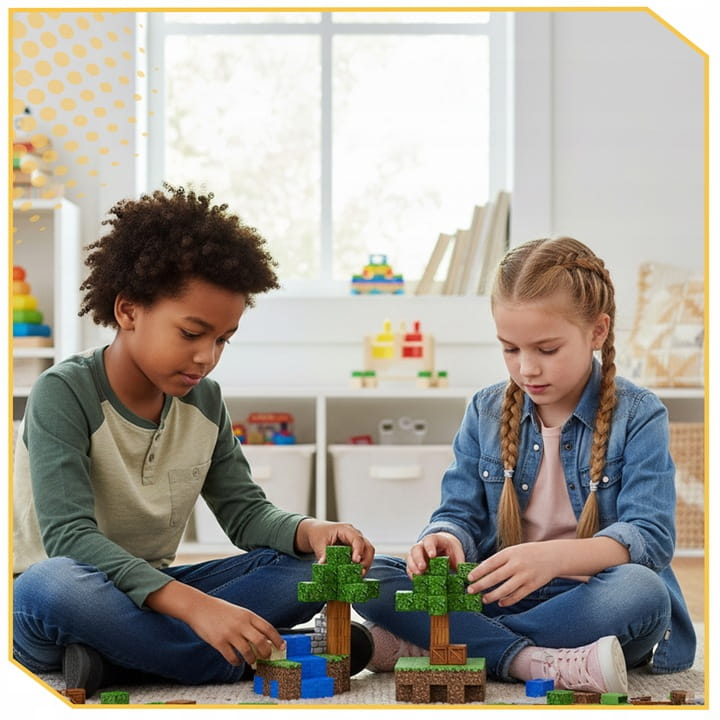 ⮕ Zestaw zawiera różne klocki, które pozwalają na zbudowanie naturalnego środowiska (m.in. bloki trawy, drewna, liści) oraz różne akcesoria (tj. piec, stół warsztatowy, książki).